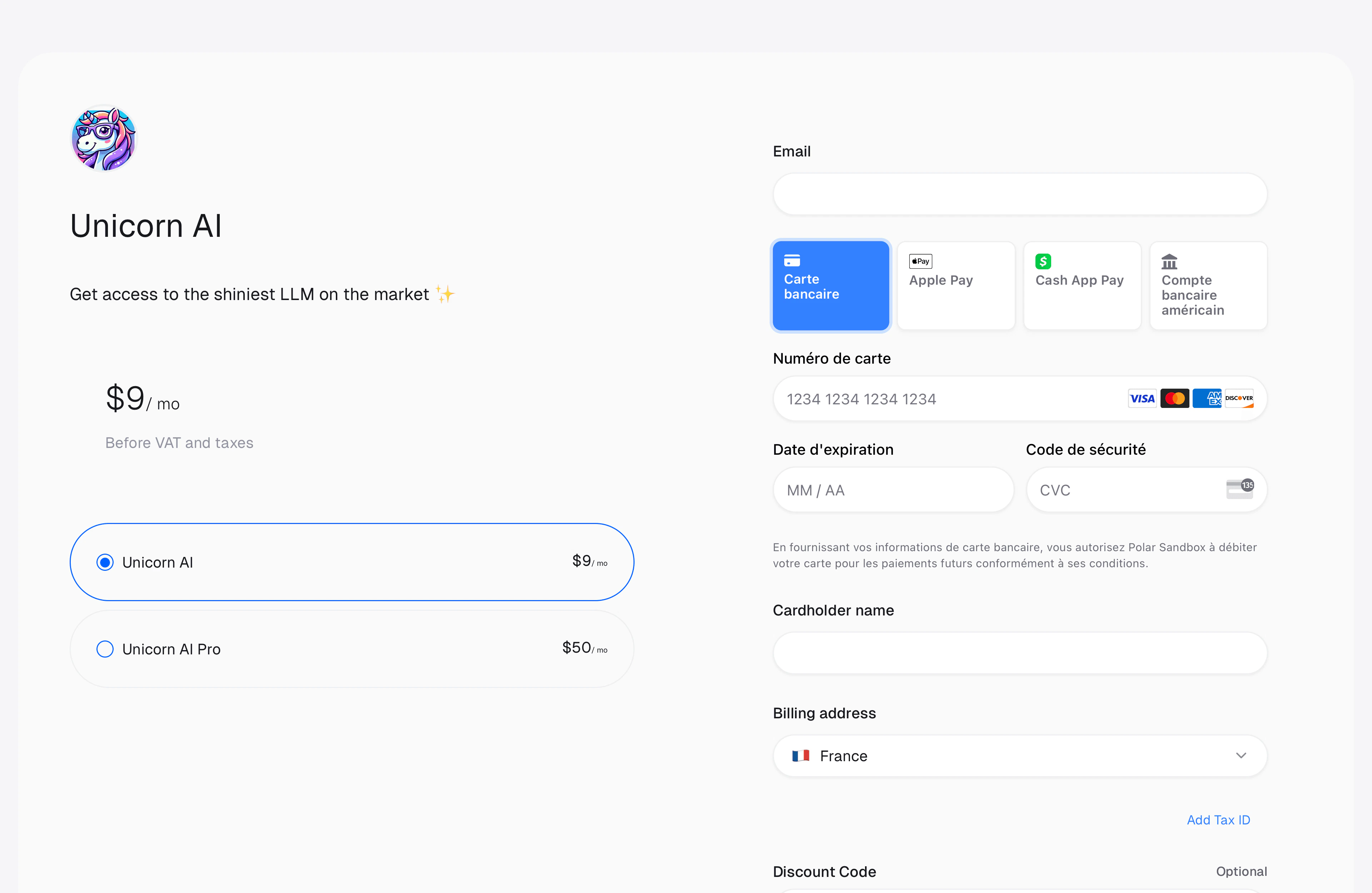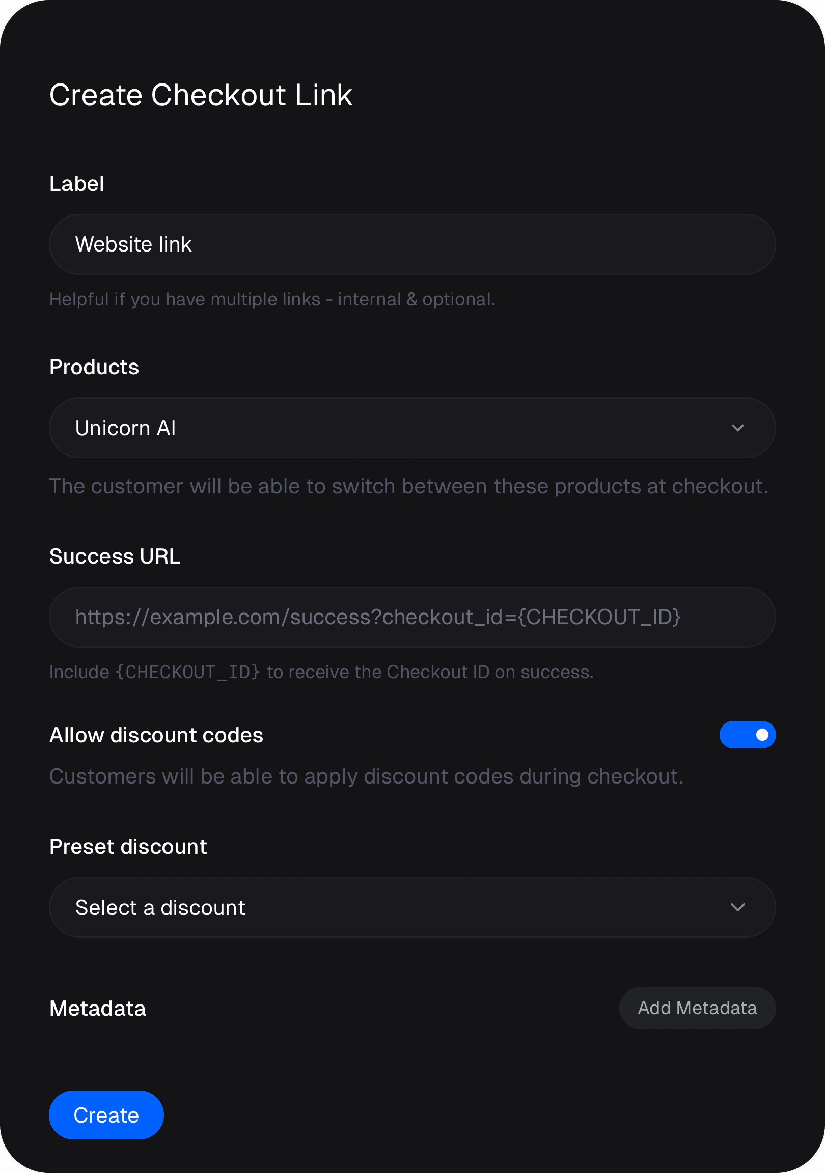 You can preset a discount on the Checkout Link: it will be automatically applied when the customer lands on the checkout page — no action needed from the customer. This is particularly useful for running promotions or offering special pricing through specific links. If Allow discount codes is enabled, customers can still manually enter other discount codes during checkout, even when a discount is preset.Metadata