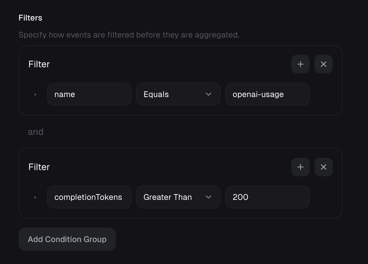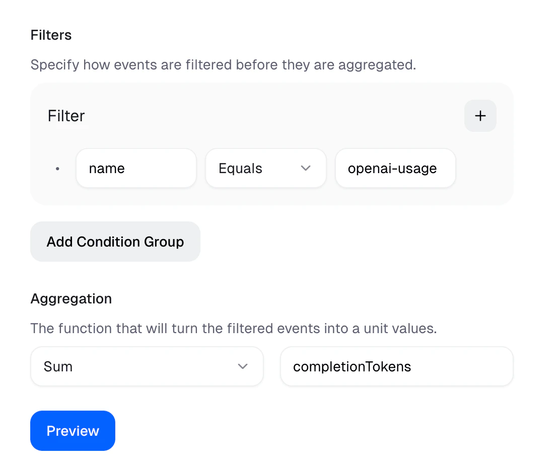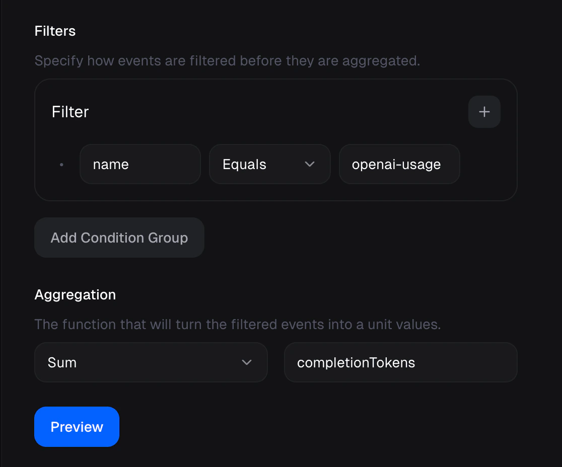 The following Meter Filter & Aggregation will match events that have the name openai-usage and sum units over metadata property completionTokens.