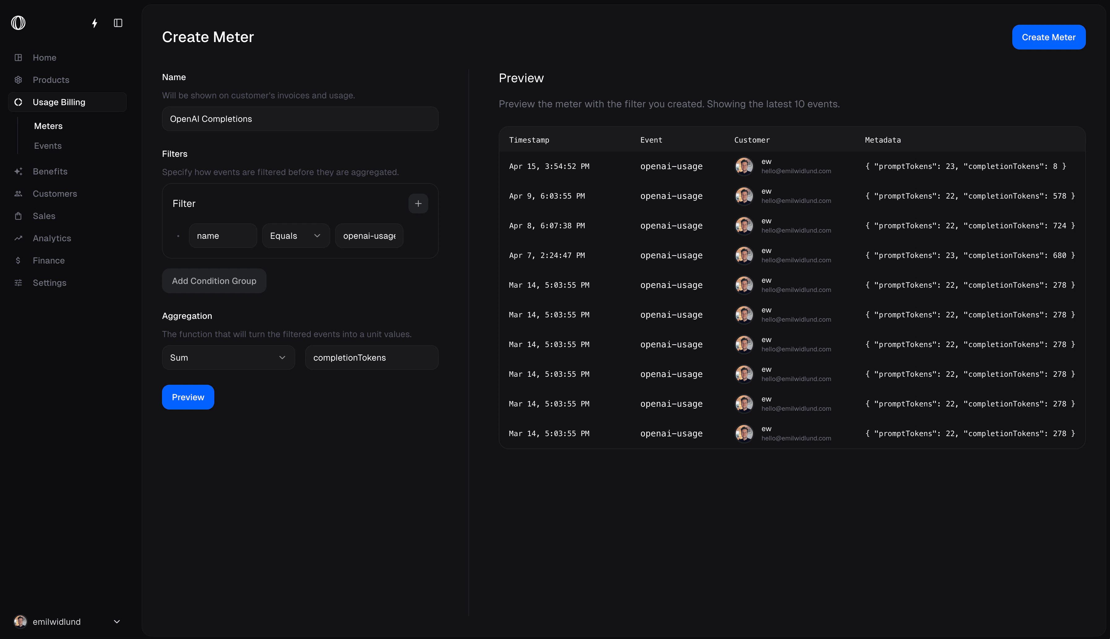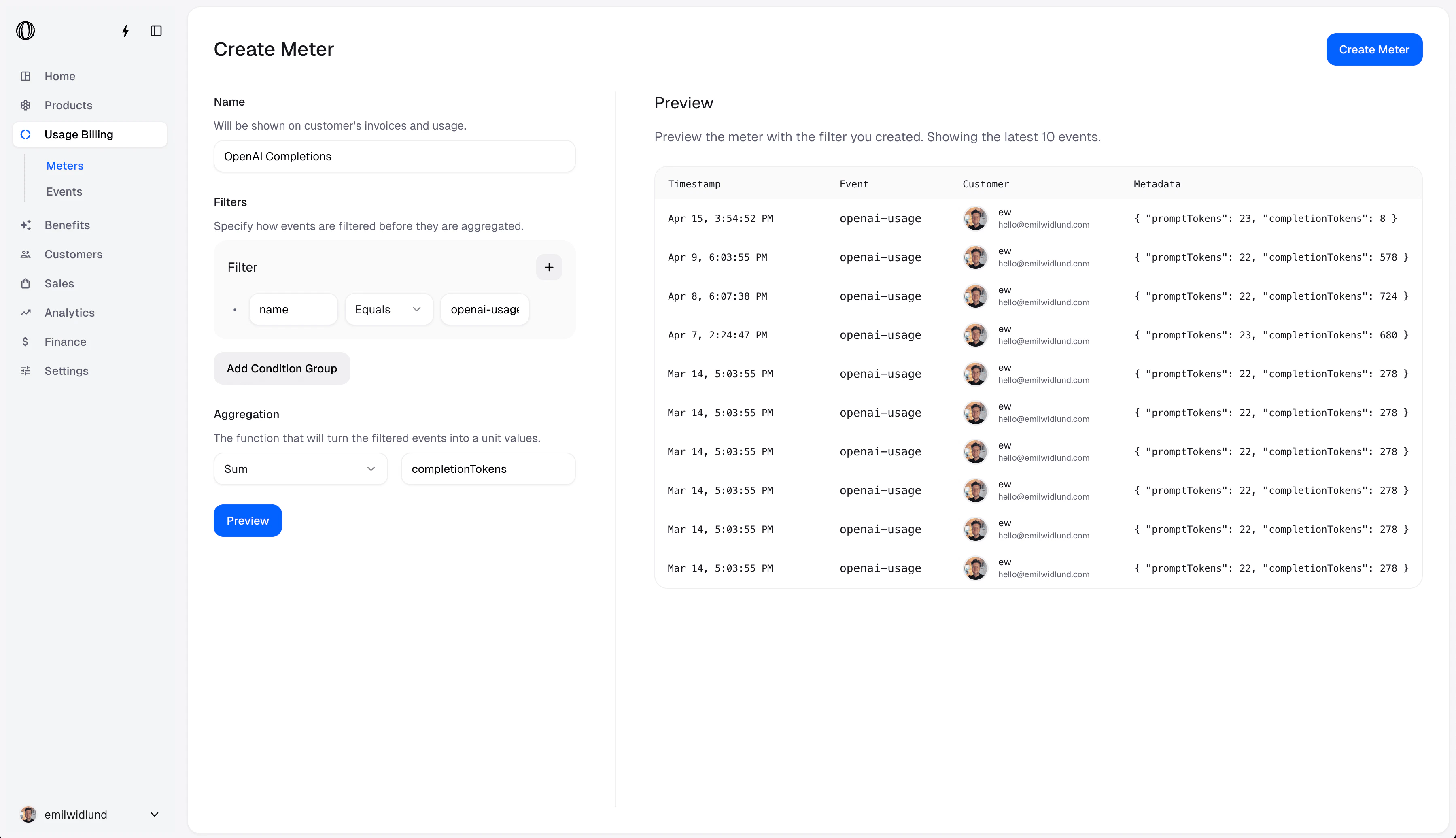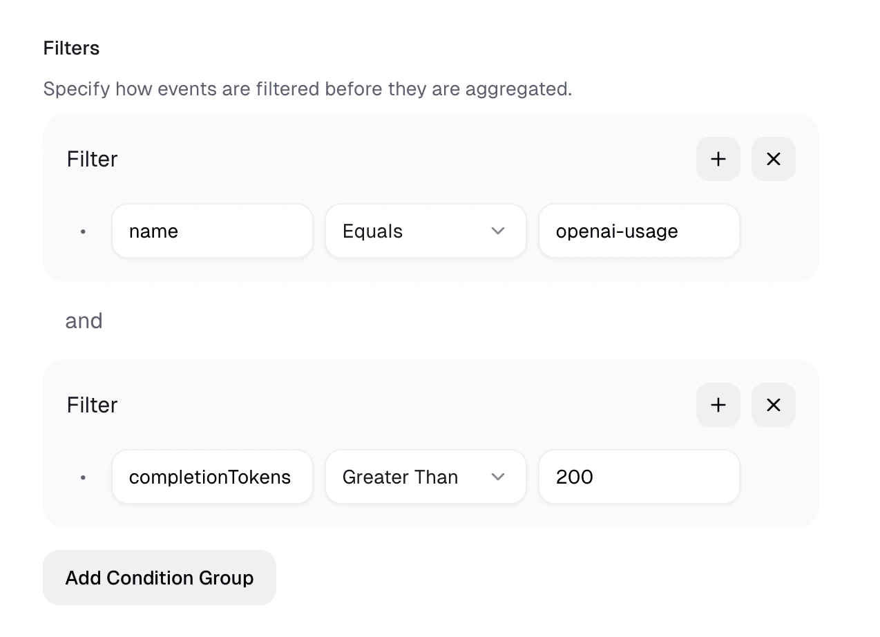 The following Meter Filter & Aggregation will match events that have the name openai-usage and sum units over metadata property completionTokens.